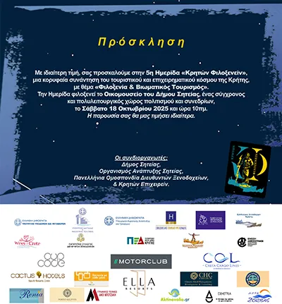 The 5th Conference, co-organized by the Municipality of Sitia, the Panhellenic Federation of Hotel Managers (PODIX) and the Sitia Development Organization, is being organized this year in Sitia, on Saturday, October 18, 2025, under the title “Hospitality & Experiential Tourism”, having as its main theme the interaction of hospitality with the life experiences that Crete offers to visitors.